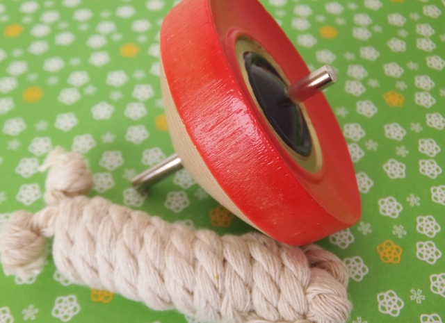 - ひもを引く力でまわすというイメージです。ひもの引き具合の調整が独楽をよくまわすためのコツです